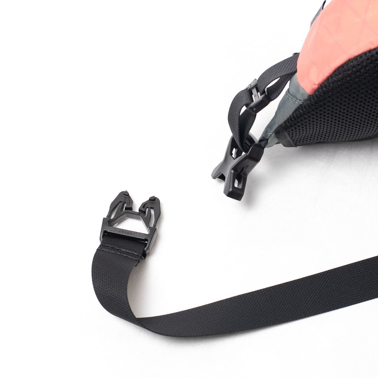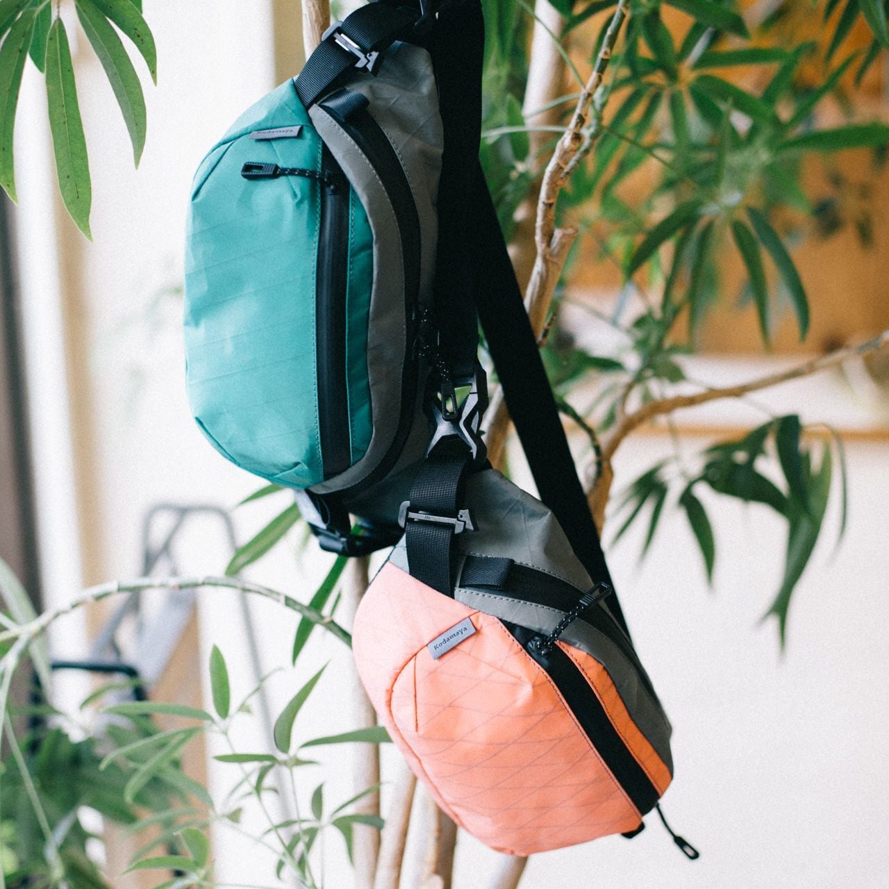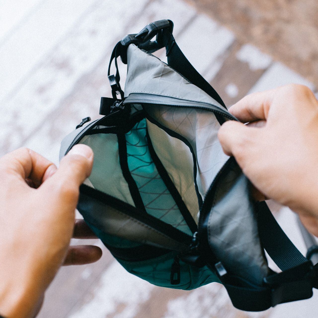 山行から日常まで、貴重品と必要最小限を快適に携行できるウエストポーチです。湾曲とテーパーを活かしたフィット設計で歩行時の揺れを低減し、前作「Middle Bag」の安全性へのこだわりを受け継ぎました。余ったベルトは背面の隠しポケットへ収められ、見た目も動きもスマートに。