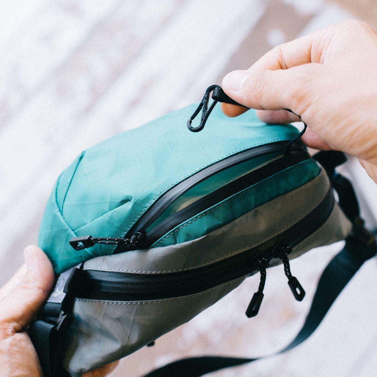 フロントポケットは小型の財布や鍵に最適で、キーフックはフロントとメインボディの間で付け替え可能。さらに背面にはスマホなどを収められる薄型ポケットを備え、行動中の取り出しやすさを高めています。