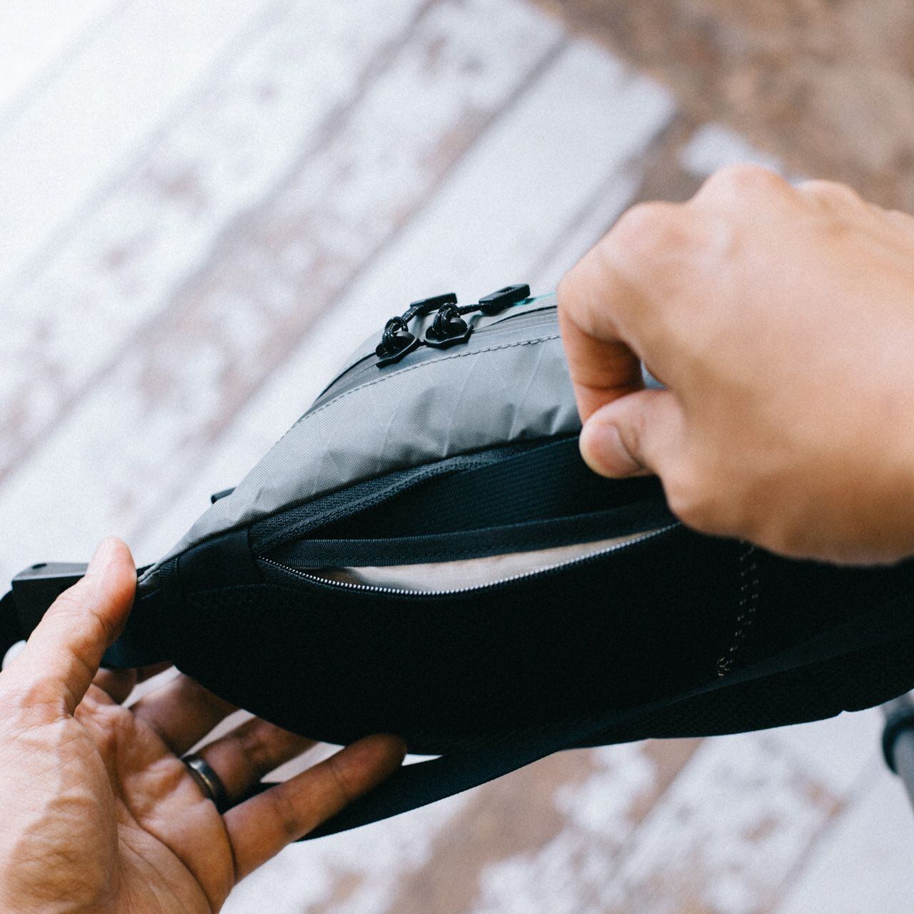 メインファスナーは上向きに配置し、引き手を見つけやすく中身も確認しやすい設計です。メインボディは約1.3Lの容量に薄物用の内ポケットを備え、必要なアイテムをすっきり収納できます。