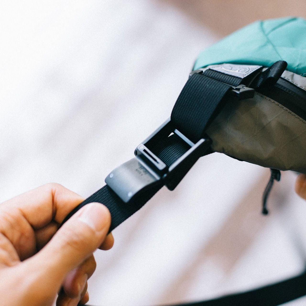 バックルは側面に配置し、着脱はスムーズ。長さ調整は反対側のカムバックルで行い、余ったベルトは背面の隠しポケットへすっきり収納できます。レバー操作で素早く短くでき、一度合わせれば頻繁な再調整は不要です。