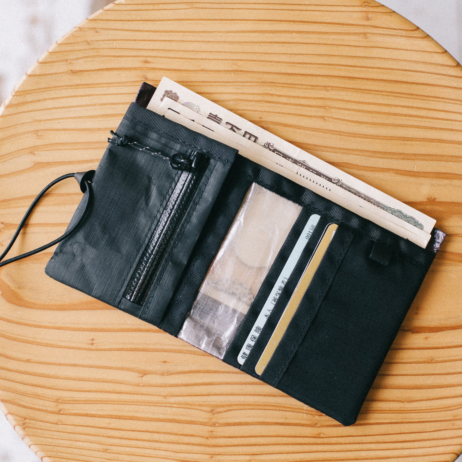ドローコードで留めるデザインが印象的な二つ折り財布です。
