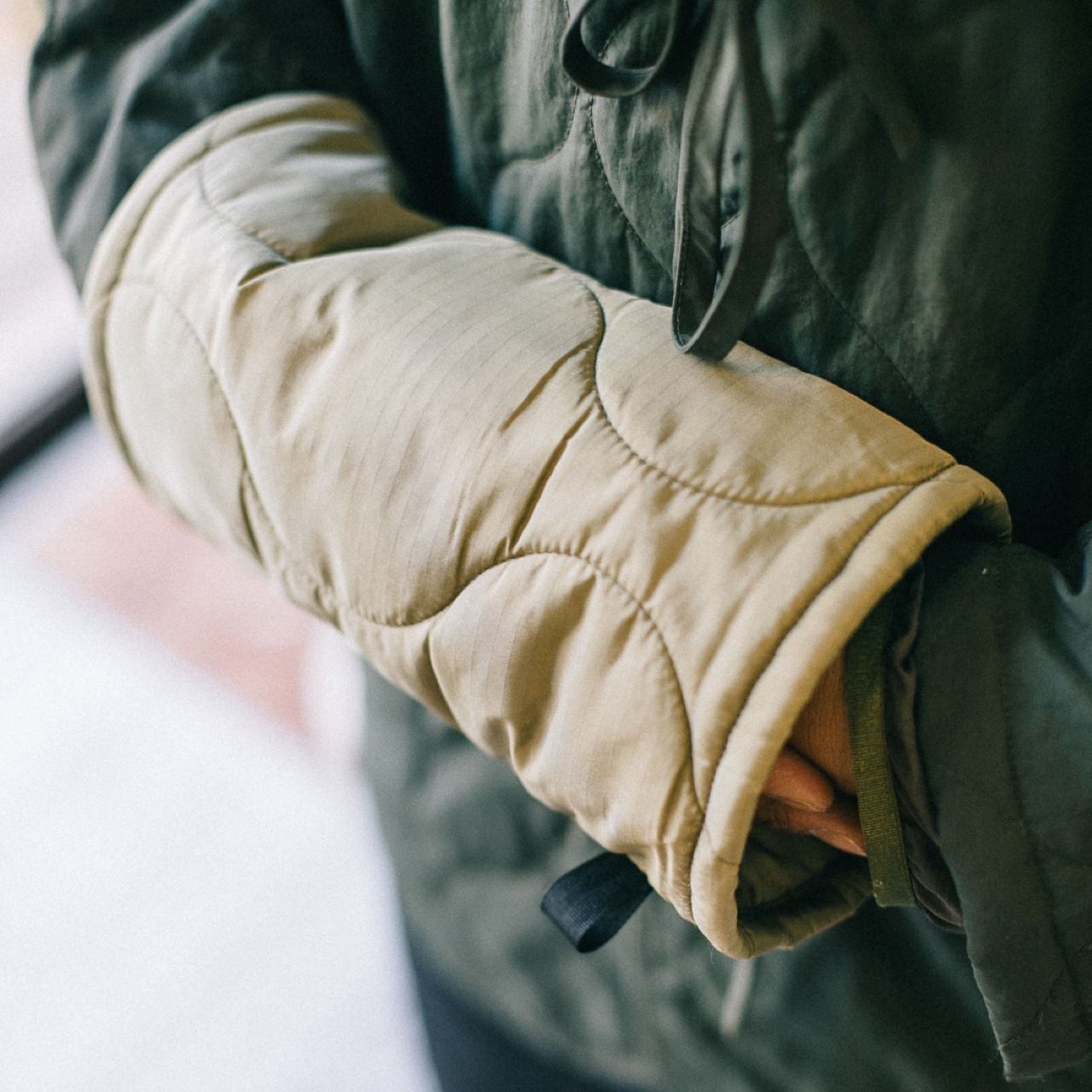 両手をまとめて保温することで、それぞれの手の温度によって驚くほど暖かく感じます。多少の雨や雪なら弾く撥水ナイロンポリを使用。軟らかい手触りの生地で、ふわっと包み込みます。