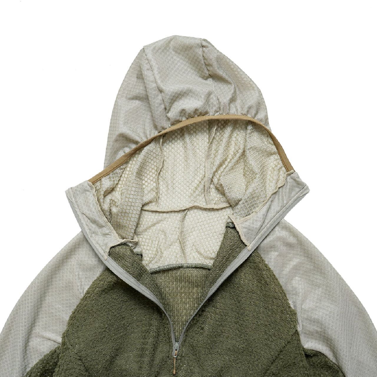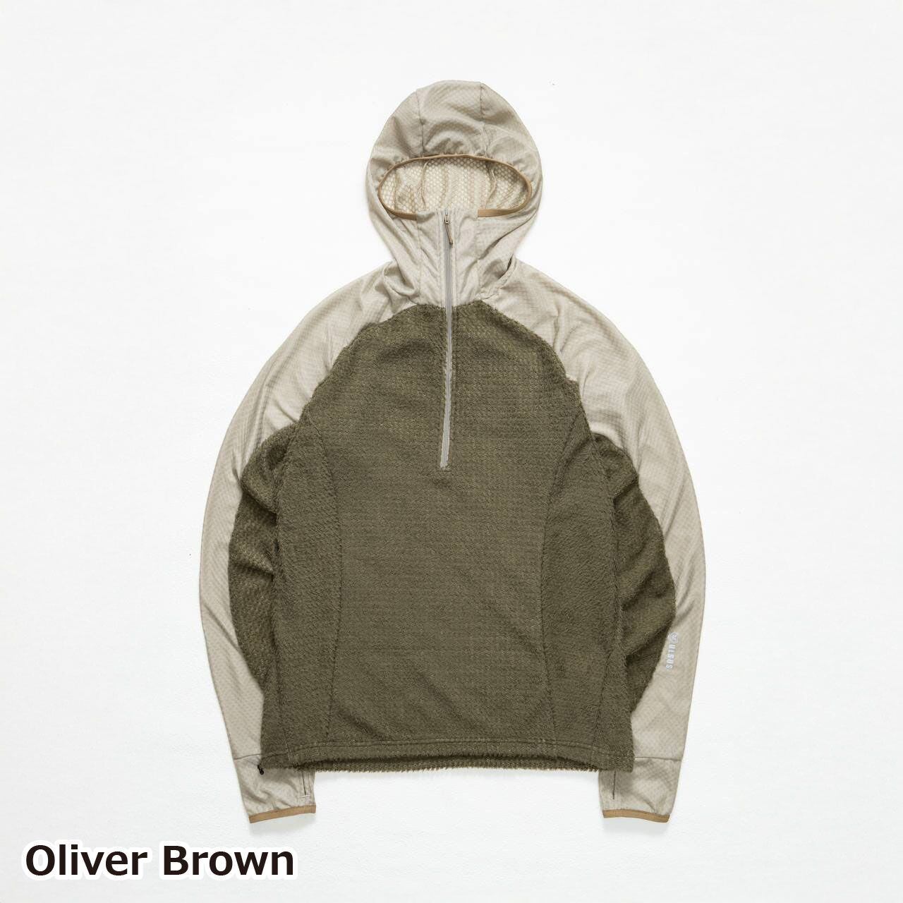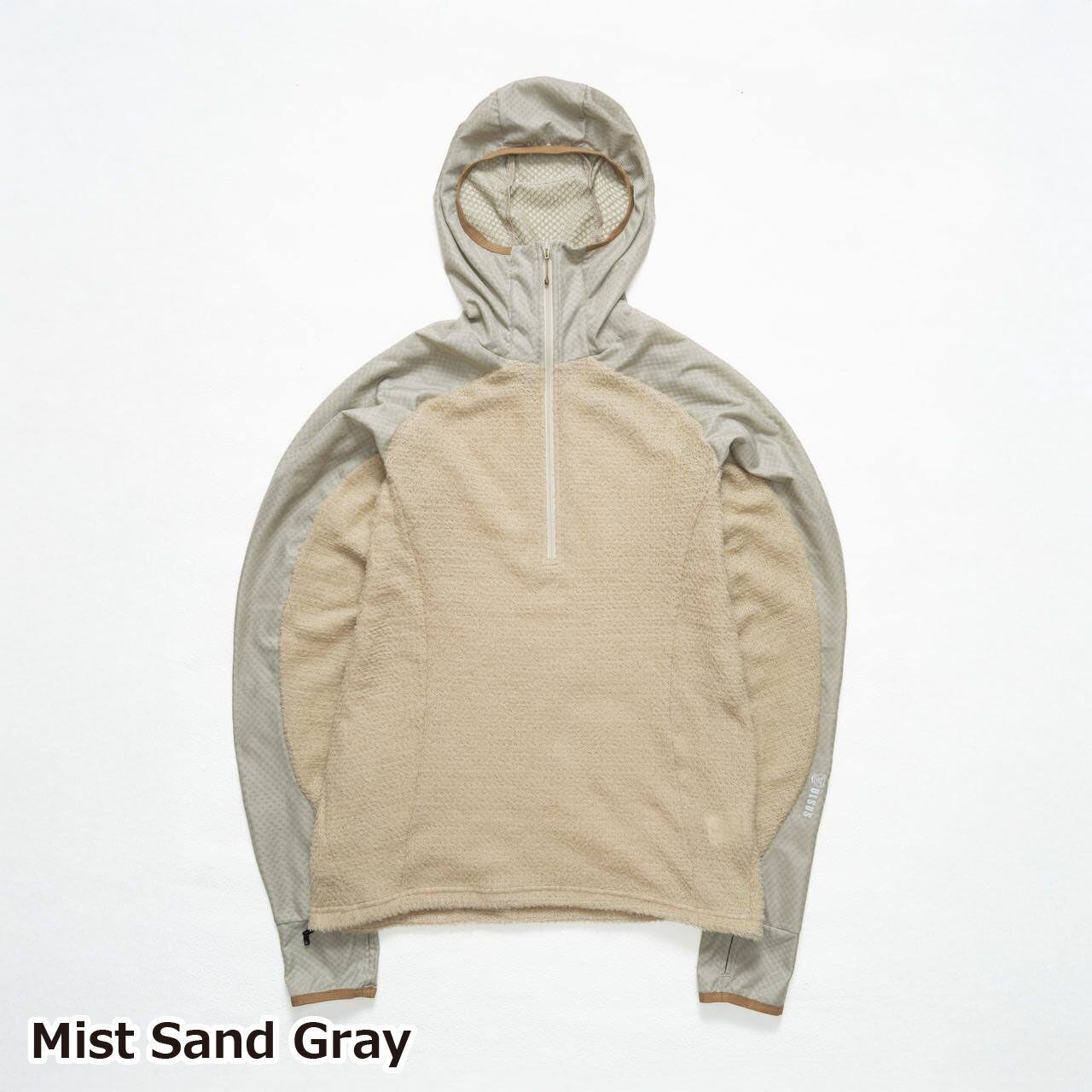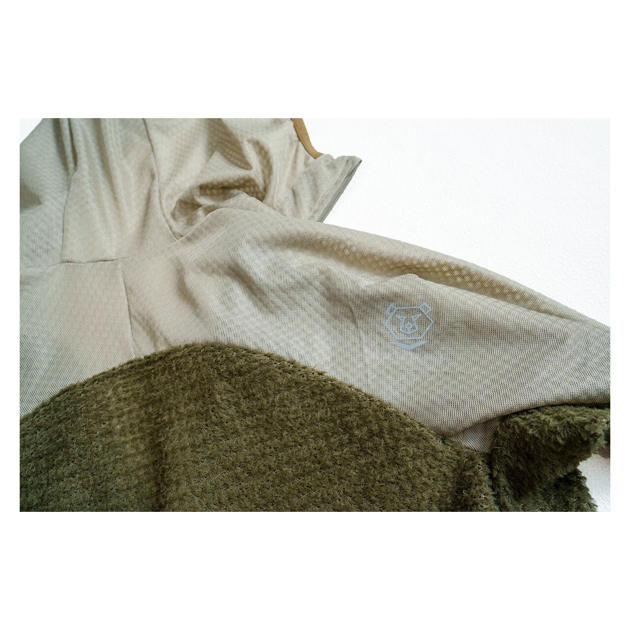 フード全体にOCTA®素材を使用。顔まわりの接触部分は起毛面を内側に向けて二重に縫製し、口元へのあたりをやわらかくしています。ジッパー引き手にはスライダーカバーを設け、肌への直接接触を防ぐ設計です。