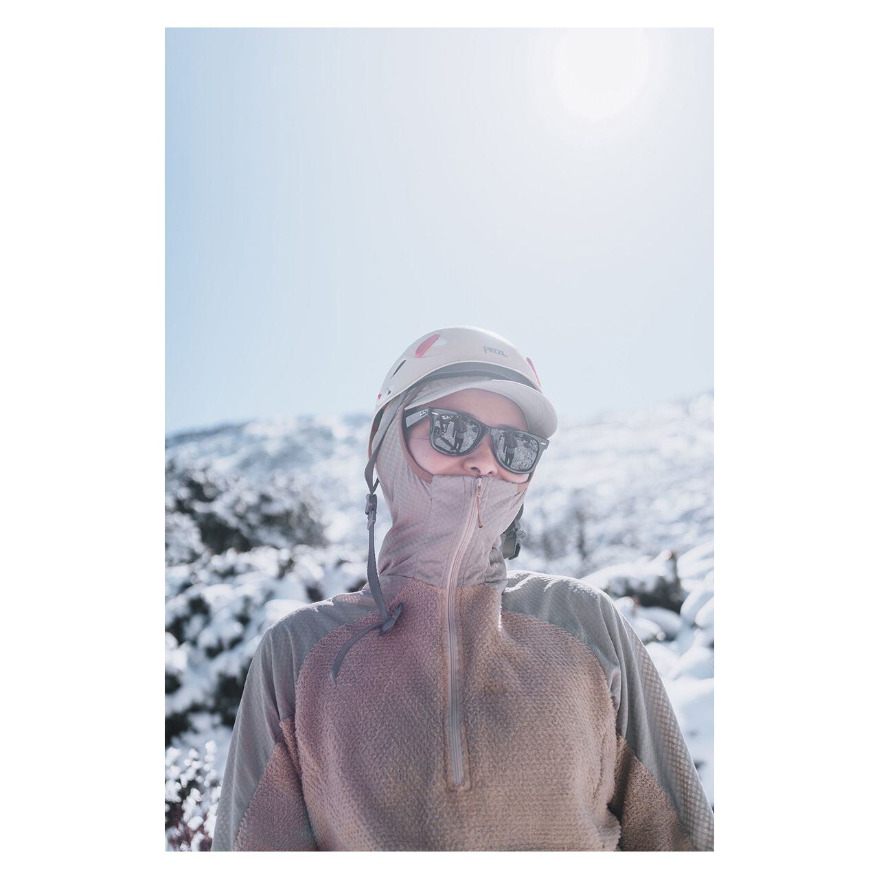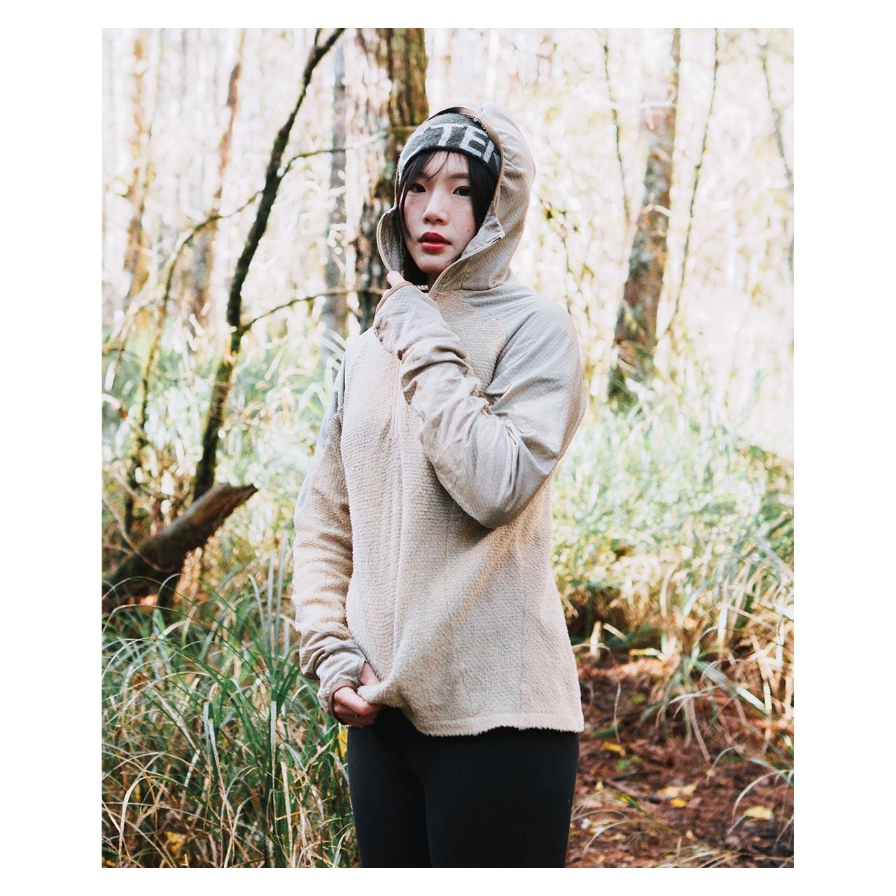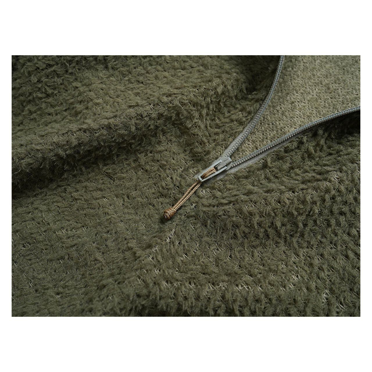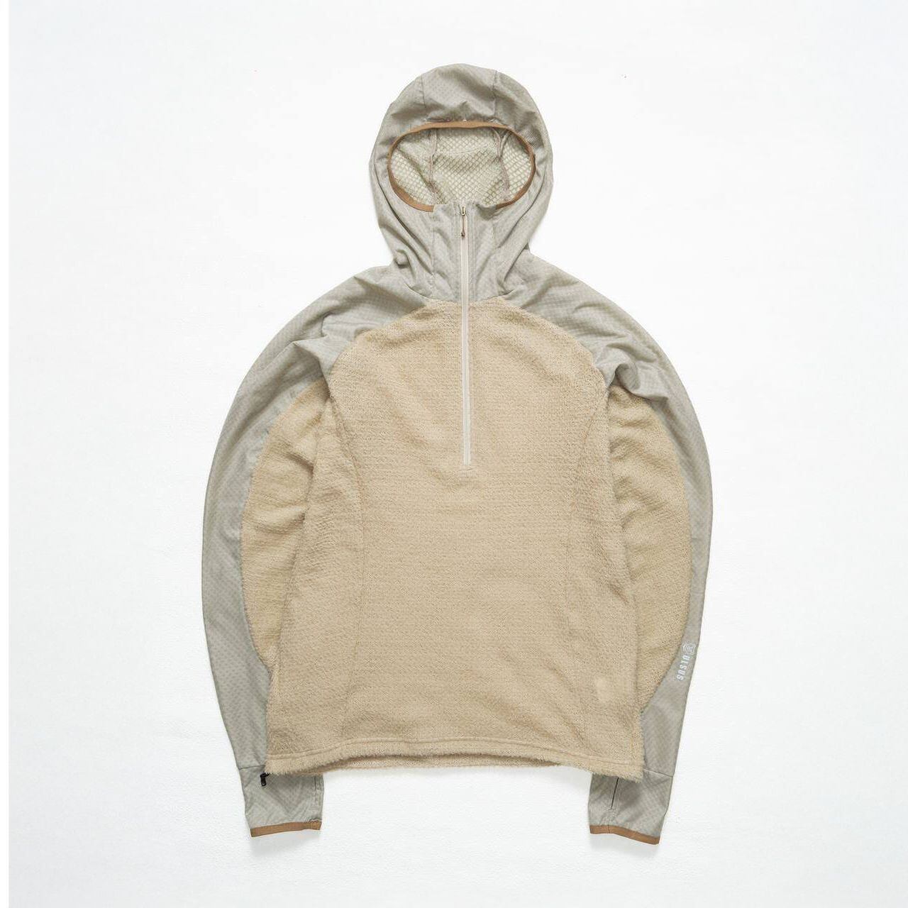 フード全体にOCTA®素材を使用。顔まわりの接触部分は起毛面を内側に向けて二重に縫製し、口元へのあたりをやわらかくしています。ジッパー引き手にはスライダーカバーを設け、肌への直接接触を防ぐ設計です。